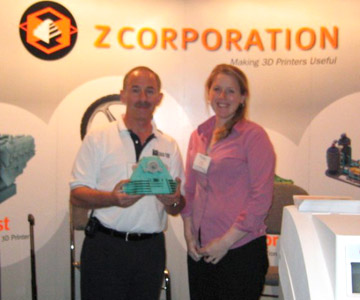 Kaitlin O'Brien, Marketing Associate for Z Corp. presenting Miroslav the 3D print of the Ducati Desmo head |